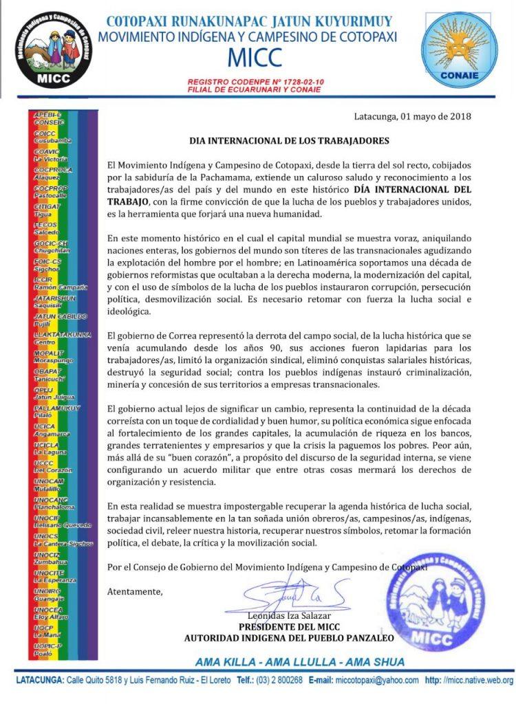 Latacunga, 01 mayo de 2018 DIA INTERNACIONAL DE LOS TRABAJADORES El Movimiento Indígena y Campesino de Cotopaxi, desde la tierra del sol recto, cobijados por la sabiduría de la Pachamama, extiende un caluroso saludo y reconocimiento a los trabajadores/as del país y del mundo en este histórico DÍA INTERNACIONAL DEL TRABAJO, con la firme convicción […]