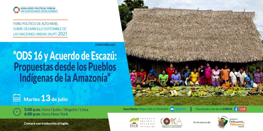 El pasado martes, 13 de julio, la Coordinadora de las Organizaciones Indígenas de la Cuenca Amazónica (COICA), a través de su Programa de Defensa de Defensores y Defensoras Indígenas, con el apoyo de Derecho, Ambiente y Recursos Naturales (DAR), organizaron el evento paralelo “ODS 16 y Acuerdo de Escazú: Propuestas desde los Pueblos Indígenas de […]