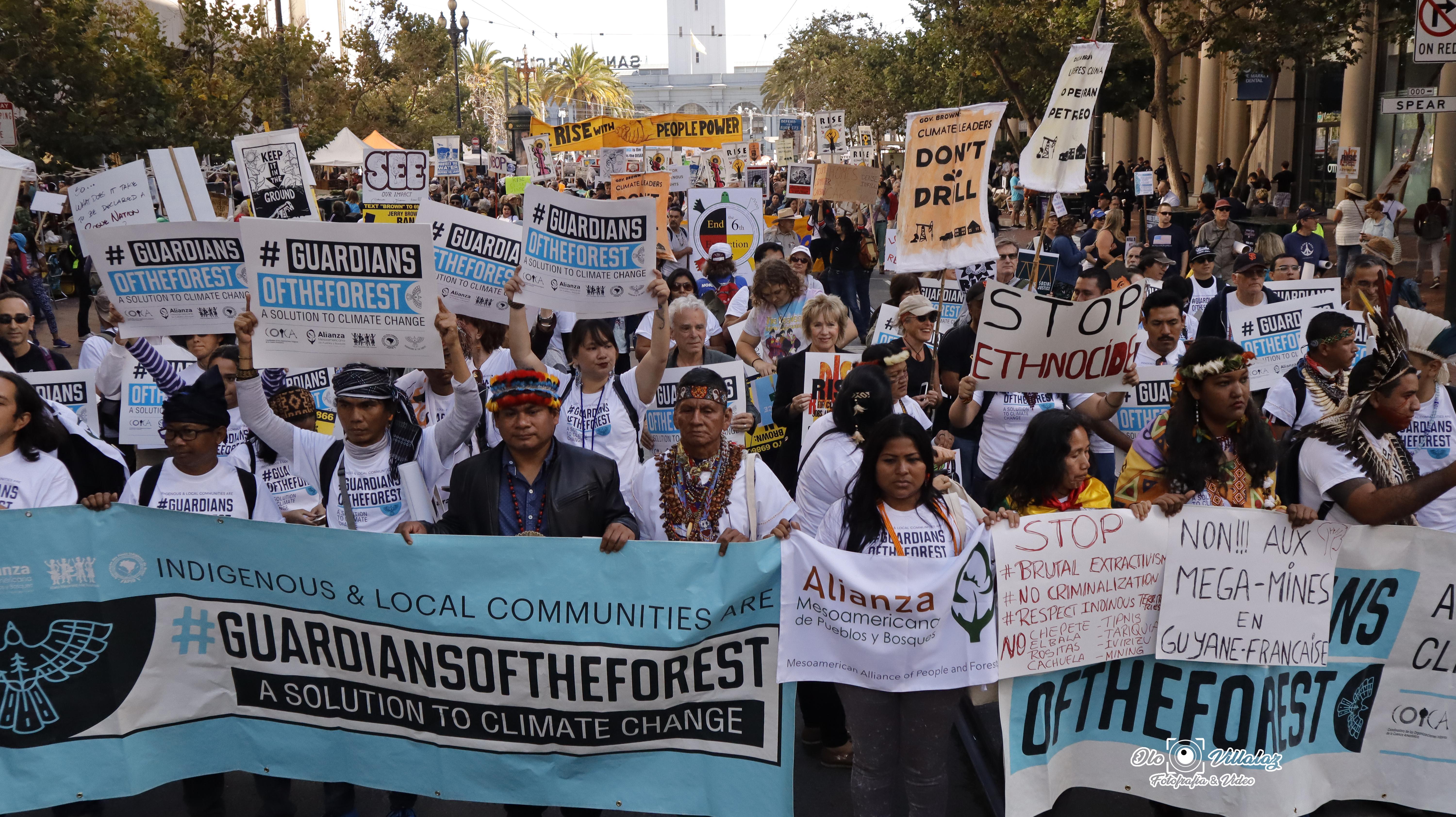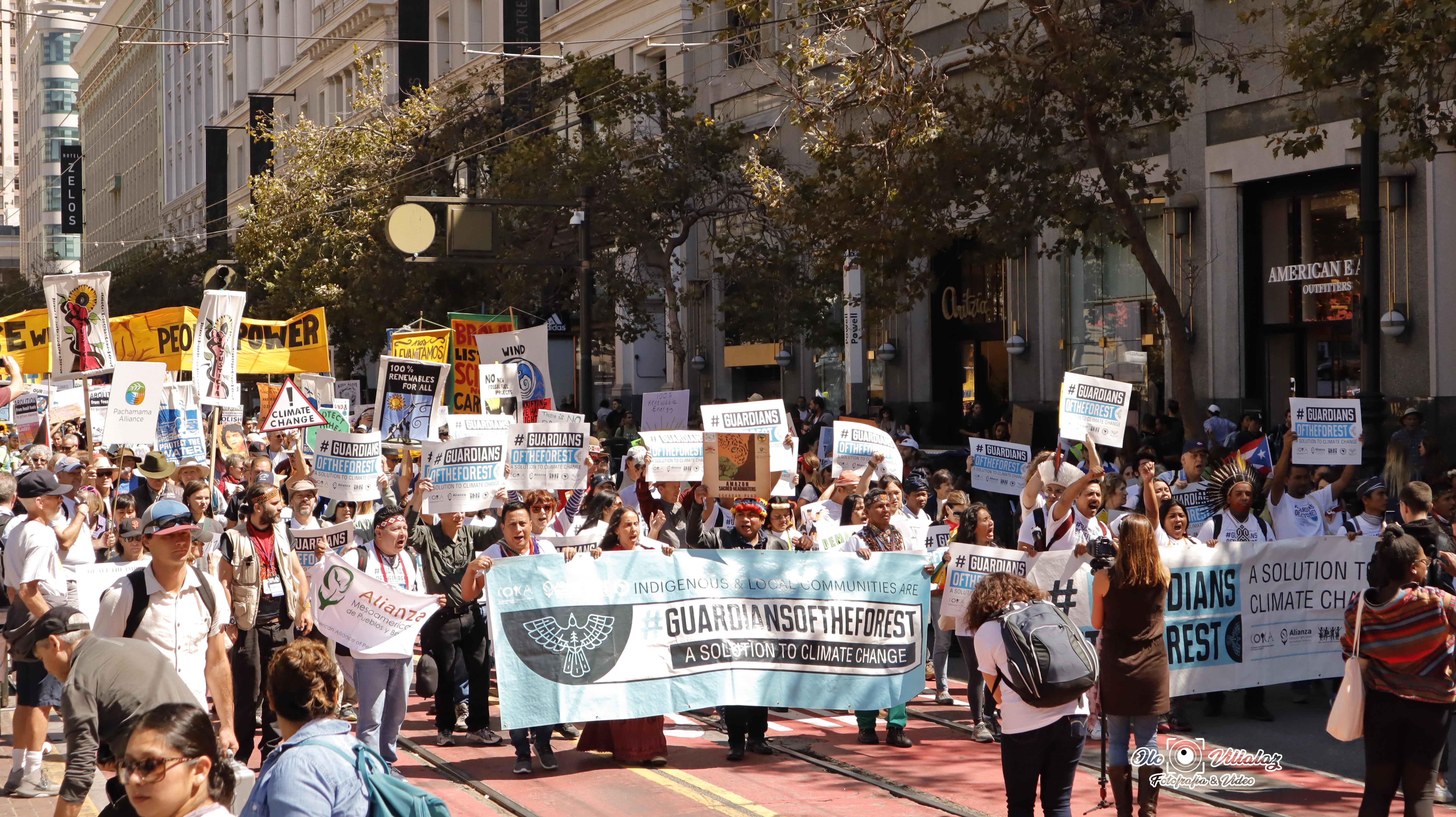 Bajo las consignas “Amazonía Viva, Humanidad Segura”, “Demarcación Territorial Ya” y “Por los bosques, nuestra vida” líderes y lideresas de la coalición global por la defensa de los bosques y los pueblos marcharon junto a más de treinta mil personas en la ciudad de San Francisco para exigir: