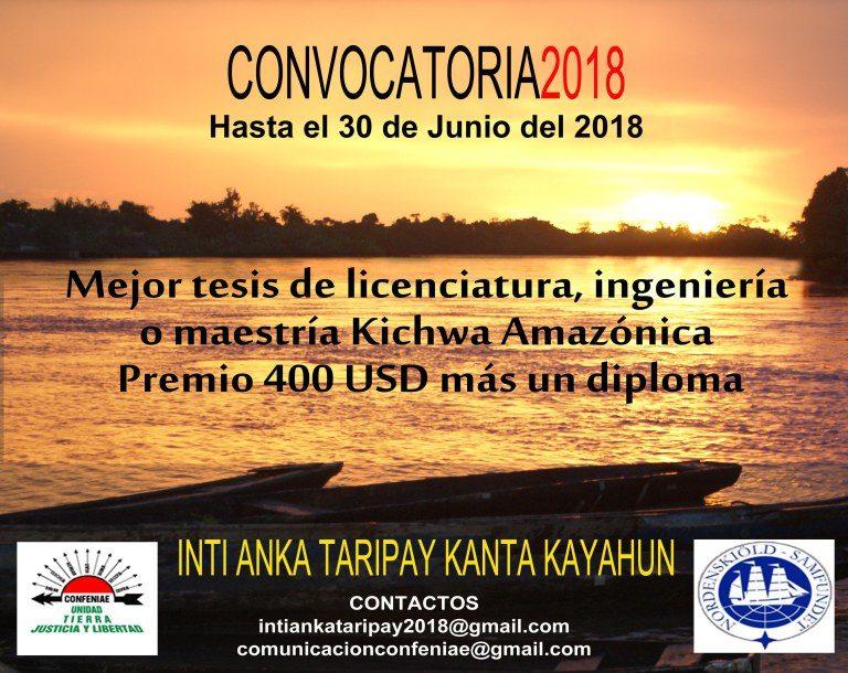 Con la finalidad de incentivar a la juventud Kichwa a sobresalir en el campo de la investigación científica y de promover el uso y desarrollo del idioma Kichwa, la asociación Inti Anka Taripay, junto con la Confederación de Nacionalidades Indígenas de la Amazonía Ecuatoriana, y auspiciada por la sociedad Nordenskiöldsamfundet (Finlandia) convoca a la primera edición del premio a mejor tesis de licenciatura, ingeniería o maestría Kichwa Amazónica. El premio consiste en un cheque de 400 USD mas un diploma.
