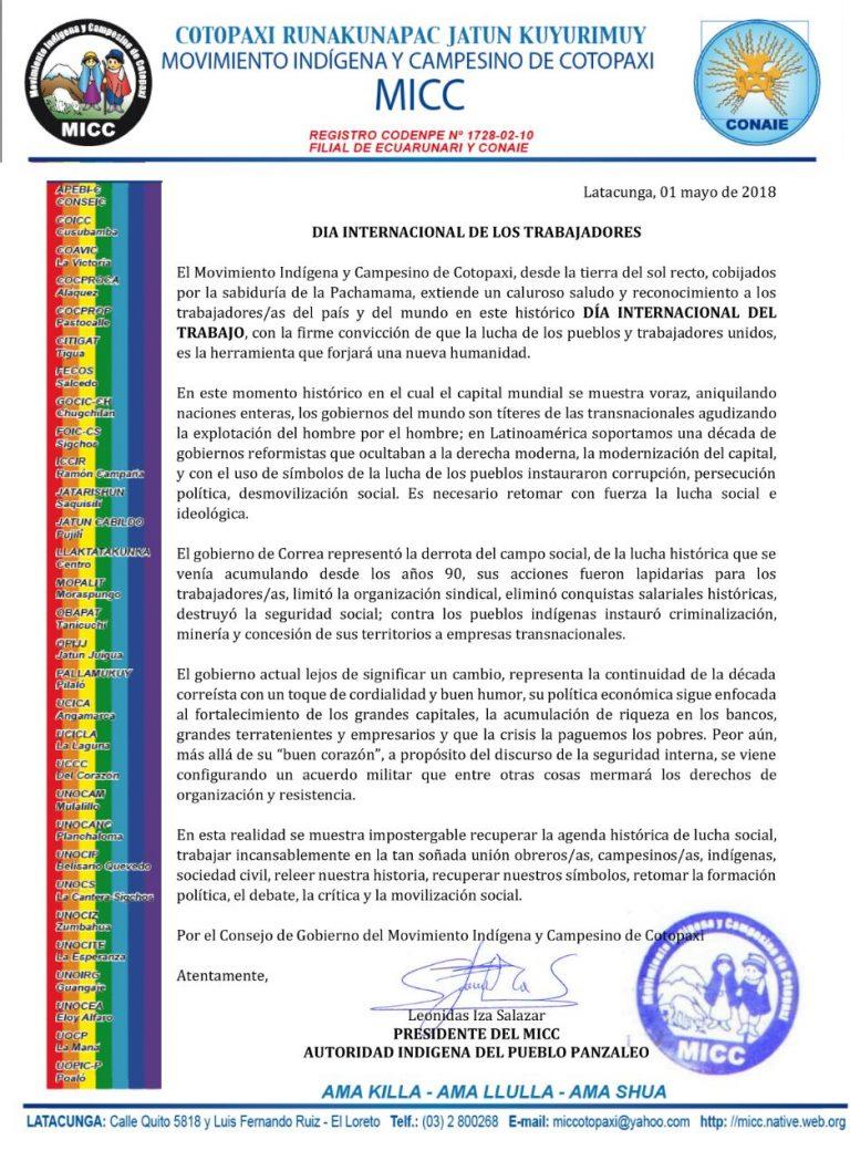 El Movimiento Indígena y Campesino de Cotopaxi, desde la tierra del sol recto, cobijados por la sabiduría de la Pachamama, extiende un caluroso saludo y reconocimiento a los trabajadores/as del país y del mundo en este histórico DÍA INTERNACIONAL DEL TRABAJO, con la firme convicción de que la lucha de los pueblos y trabajadores unidos, es la herramienta que forjará una nueva humanidad.
