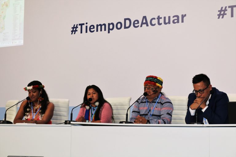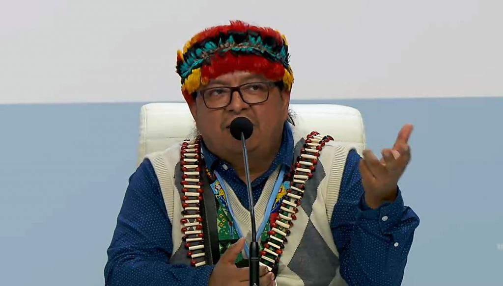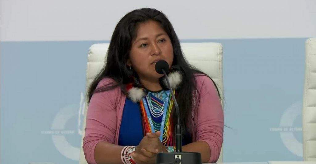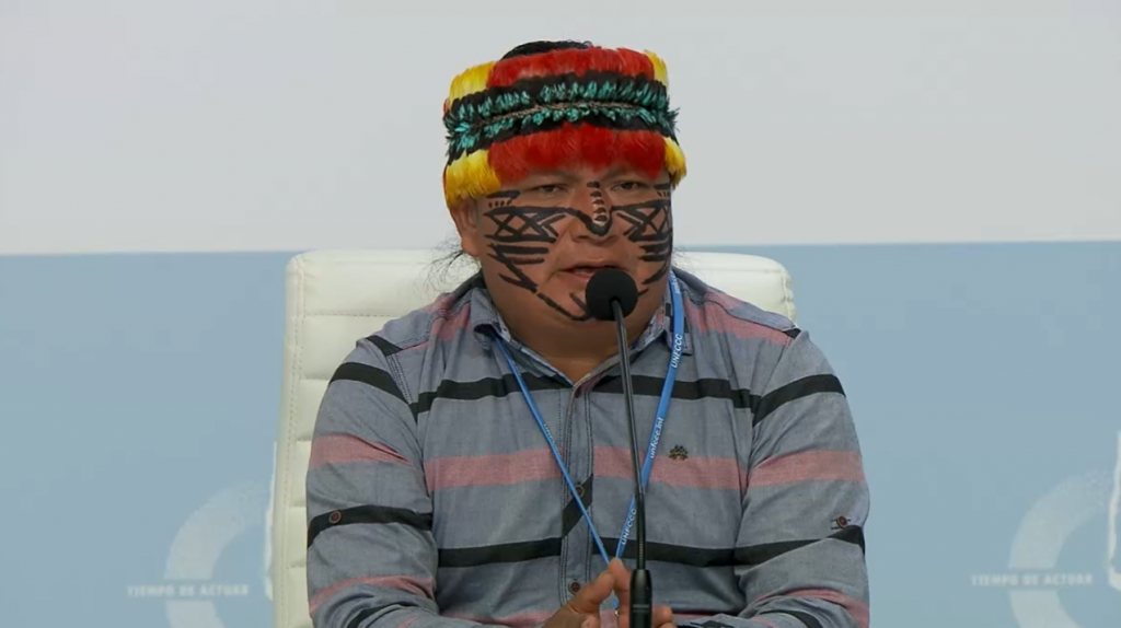 “Todos tenemos una visión diferente, esa visión de mundo, y ésta no se interpreta por los Gobiernos al punto que estamos en una COP hablándole a sordos, unos negociando por un lado sobre nuestros territorios, sobre nuestro destino y nosotros estamos por fuera de ese diálogo. Hacemos un llamado a las Naciones Unidas y sus países miembros para que en estos diálogos se garantice la participación real y efectiva de los pueblos indígenas, de lo contrario solo es una “Feria” de negocios del clima. La COICA sienta su voz de protesta en el sentido de que los Gobiernos deben escuchar a los pueblos originarios porque no solo está en juego la vida de nuestros hijos, sino también de la humanidad”, sostuvo López.