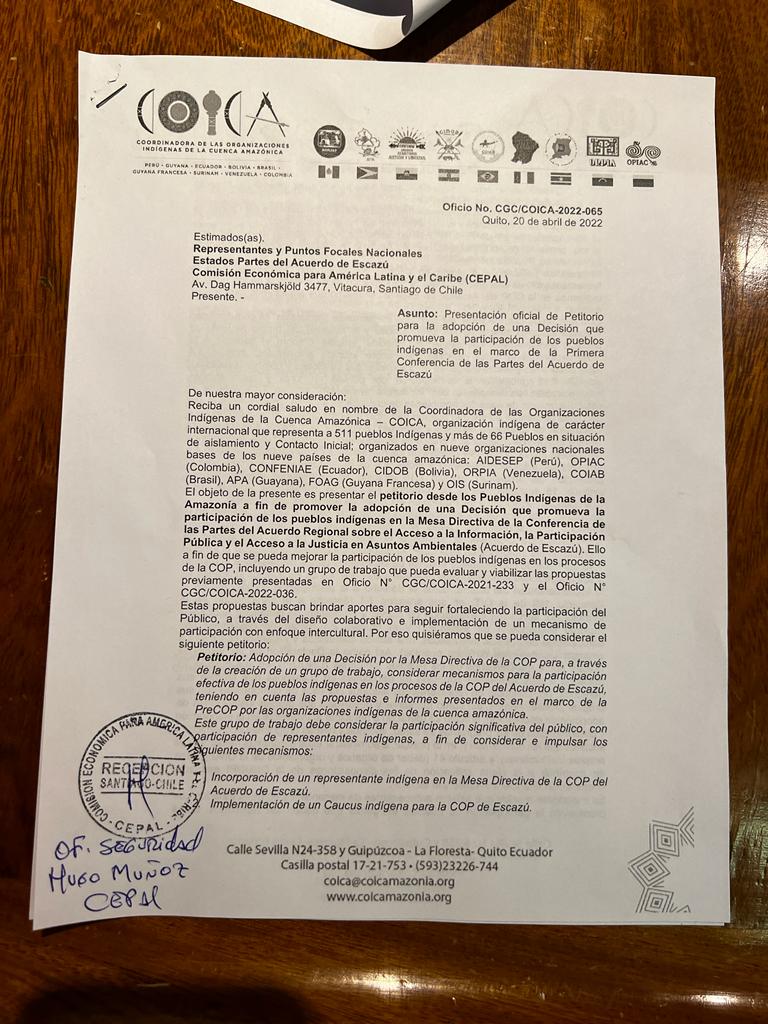 En este contexto, la COICA en representación de los Pueblos Indígenas de la Amazonía, presentó un petitorio ante la Comisión Económica para América Latine y el Caribe (CEPAL), quien funge como secretaría técnica de este Acuerdo, para exigir que se garantice la existencia de mecanismos efectivos para la participación de los pueblos indígenas en los procesos de negociación e implementación del Acuerdo de Escazú; en la cual se propone que, en el marco de la COP1 se establezca un grupo de trabajo que analice y promueva los siguientes mecanismos de planteados:
