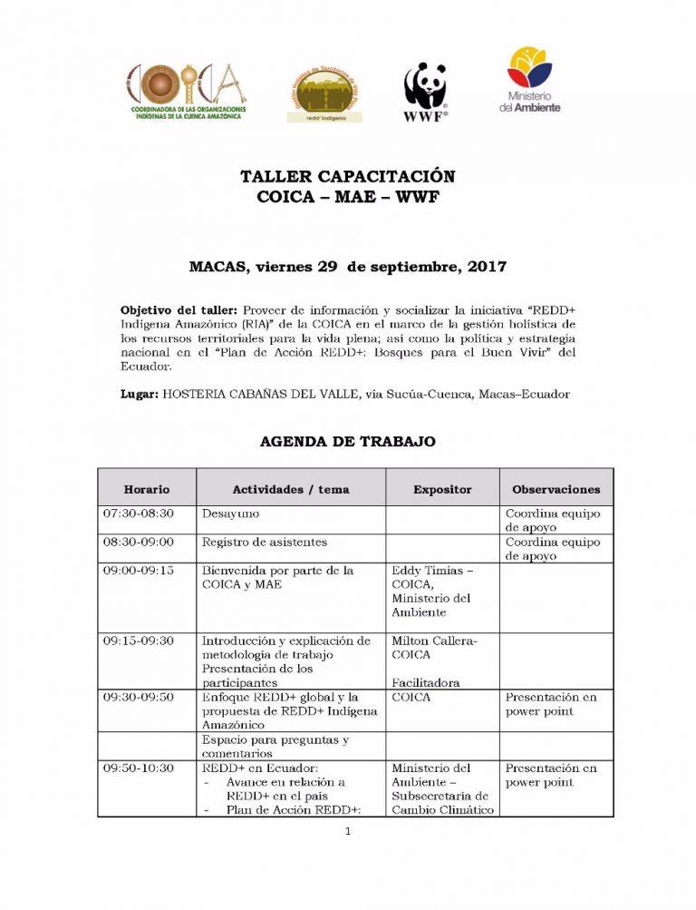 Proveer de información y socializar la iniciativa “REDD+ Indígena Amazónico (RIA)” de la COICA en el marco de la gestión holística de los recursos territoriales para la vida plena, así como la política y estrategia nacional el “Plan de Acción REDD+: Bosques para el Buen Vivir” del Ecuador.